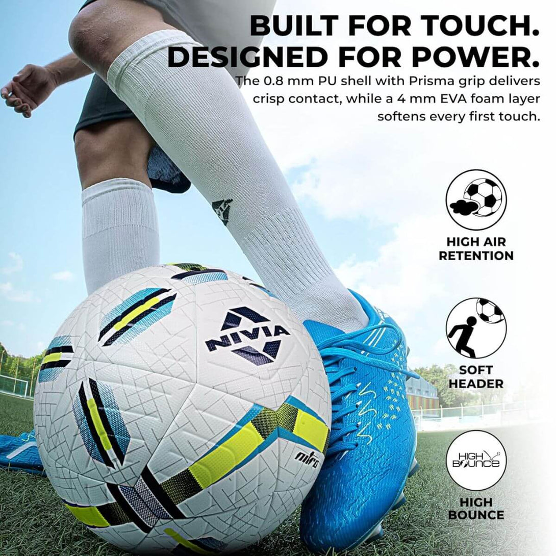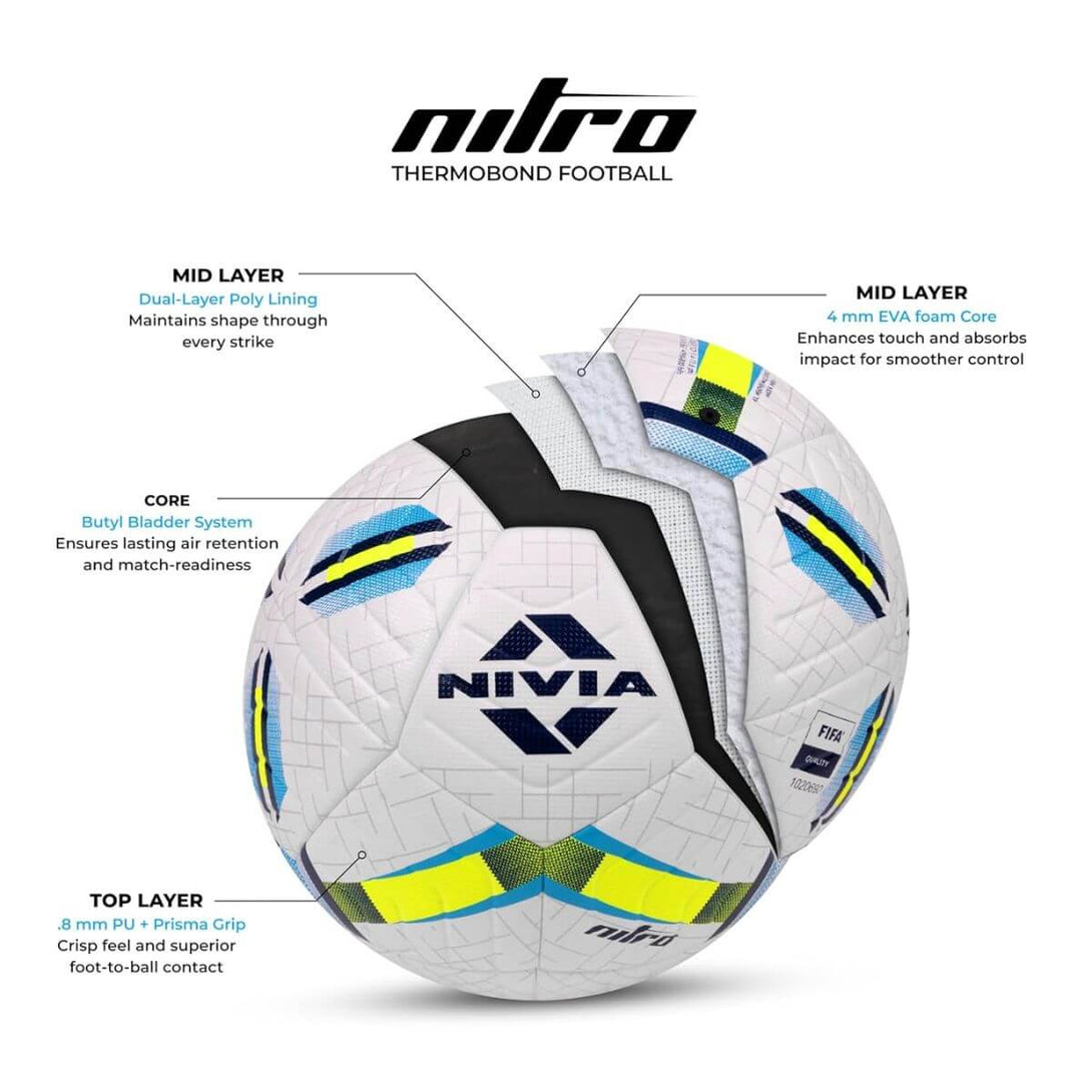 Engineered for intense play, the Nivia Nitro Football features a 0.8 mm PU shell, EVA foam core, and butyl bladder for power, control, and durability—perfect for match-level performance on any pitch.