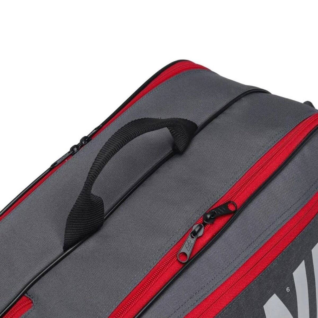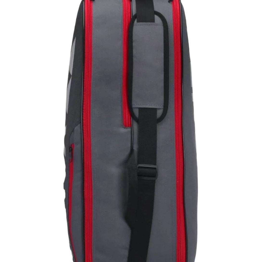 - Compartments: Two main compartments to fit 6 rackets, one medium accessory pocket, one shoe pocket